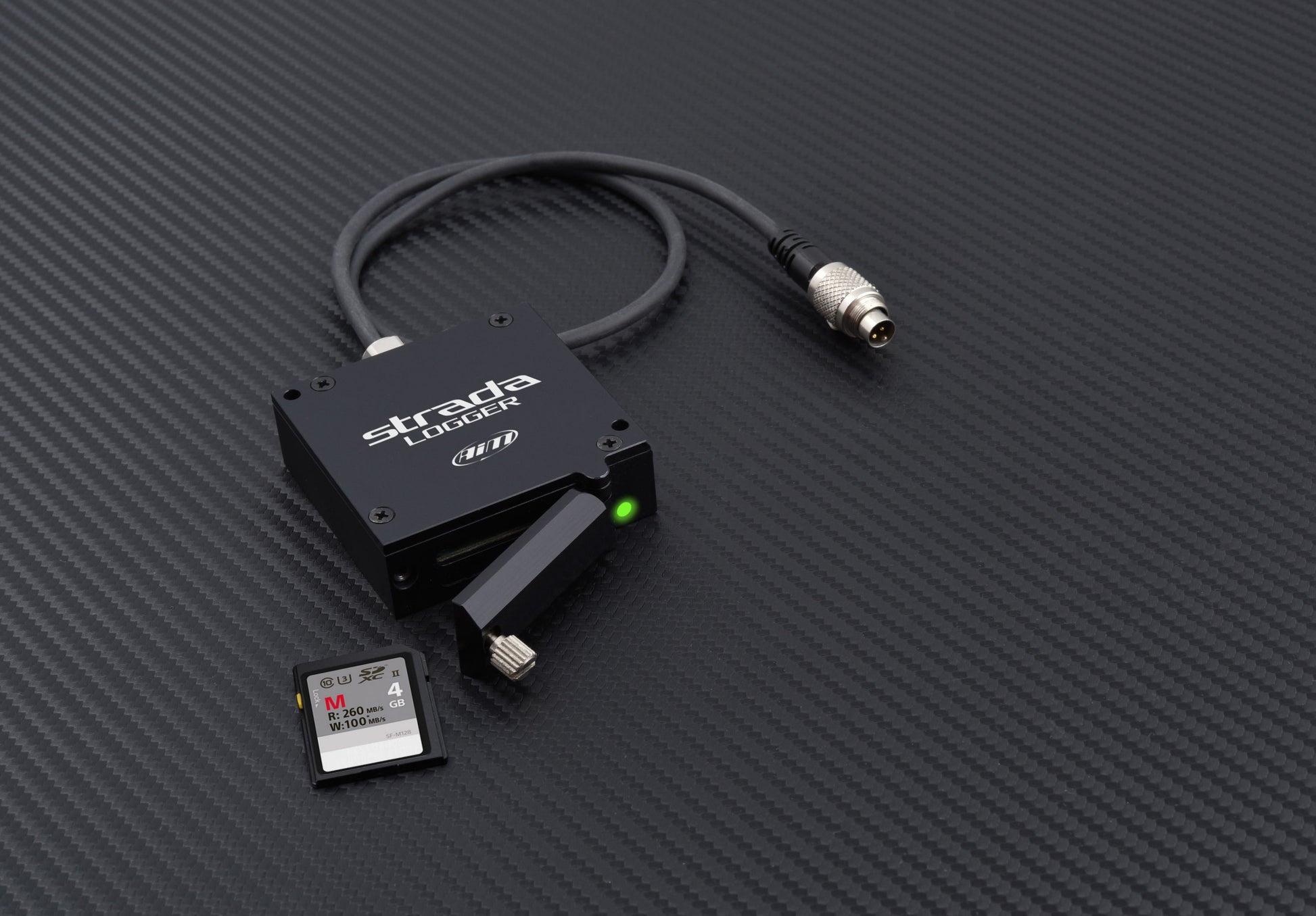 Its management is really simple: just connect Strada Kit to your AiM device and data will be saved on the SD card* as well as stored in the logger memory. No configuration is needed. The SD card* can be removed and replaced even during pit stops, while the car engine is still ON, making it extremely fast to get the data during endurance races or long tests, when the time at the paddock is really limited. When the session is over, all you need to do is moving the SD Card* from strada logger to your PC and download the data using Race Studio 3. Strada Logger features a front LED that shows its status: recording/firmware status. The kit can support up to 32 GB cards formatted as FAT32.